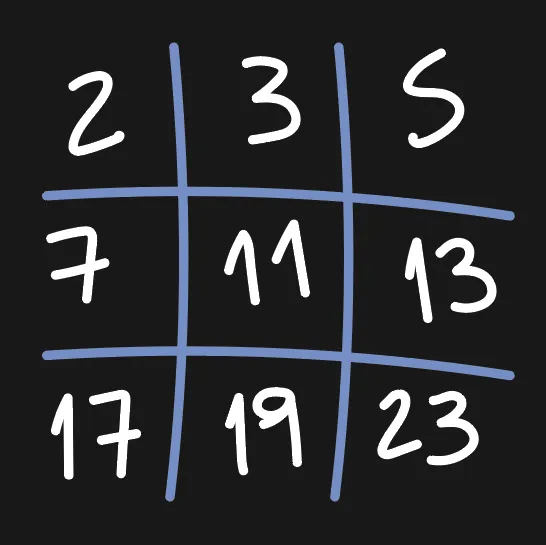 Acá es donde entra el teorema fundamental de la aritmética (TFA). Sabemos que cualquier número positivo es producto único de primos. Por lo tanto a cada una de las 8 jugadas ganadoras podemos asignarle el producto de primos de las celdas que la forman.
